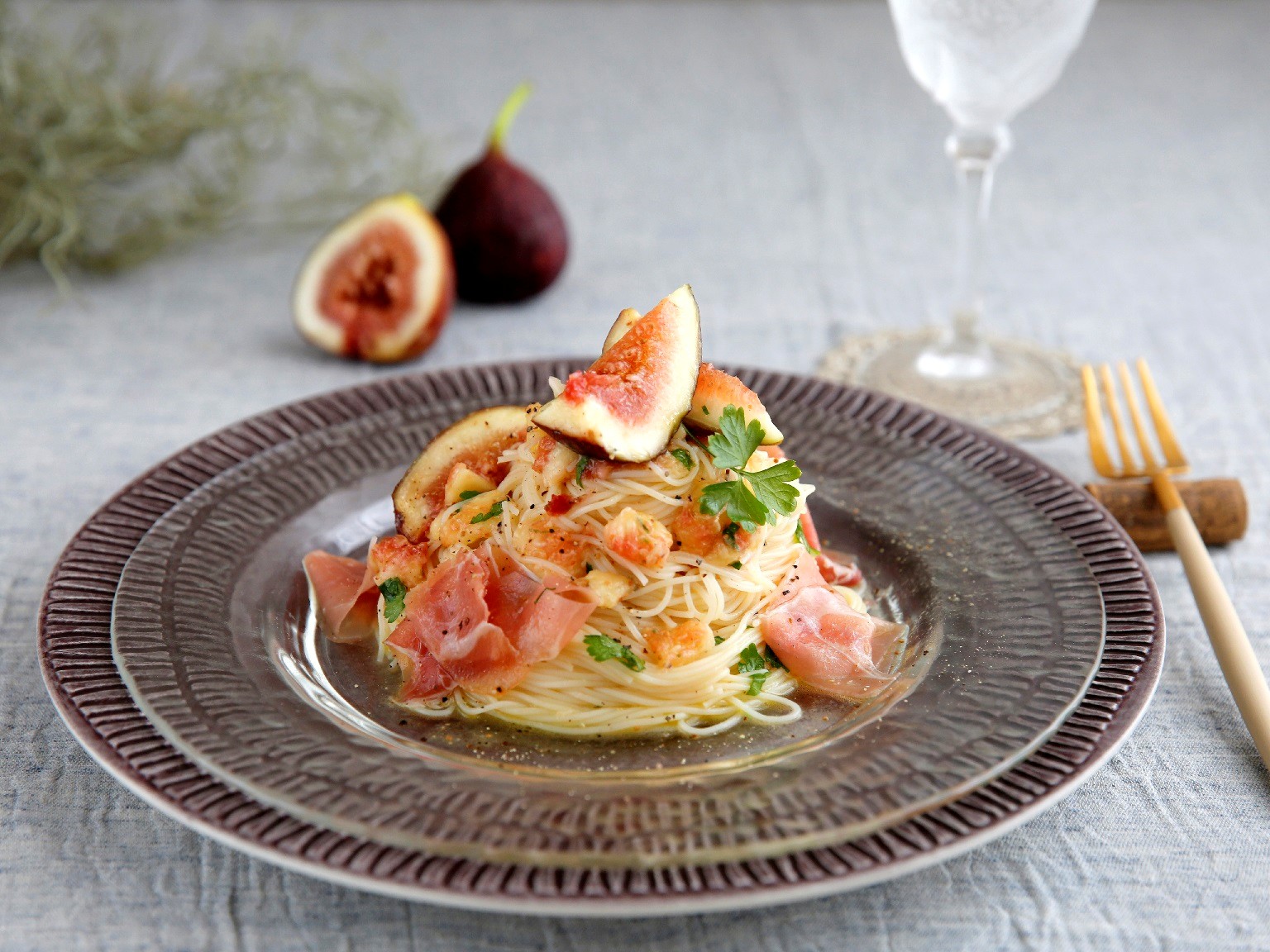 器に盛り付け、くし形に切ったいちじくと生ハムをのせる。黒胡椒を振り、イタリアンパセリを飾る。