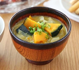 - 豆乳を加えて温め、味噌を溶き入れる。お椀によそい、小ねぎを散らす。