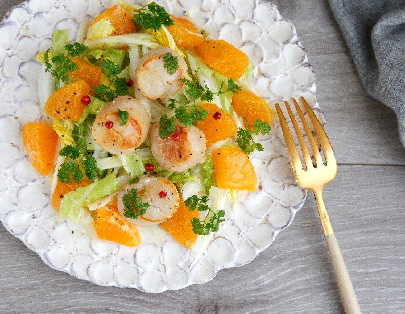 - フライパンにオリーブオイルを入れて火にかけ、ホタテを入れ、両面強火で焼き色をつける