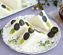 - 食パン2枚を広げ、(1)を1/2量、ぶどう9粒ずつ、残りの(1)をのせたら、もう1枚のパンでサンドする。ラップに包んで冷蔵庫で30分休ませる。