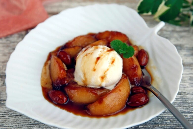 - フライパンに砂糖を入れ、色づくまで焦がす。バタ―を加え、ももとナッツをソテーしてキャラメルを煮絡める。
