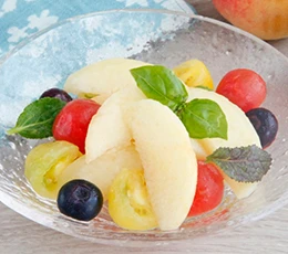 旬のフルーツを加えたスイーツ風のマリネ。酸味が苦手な方や甘さが欲しい際は、マリネ液にハチミツを加えてください!