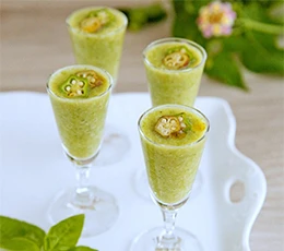 - オクラはガクを取り除き、板ずりする。熱湯で1分茹で、冷水に落とす。フードプロセッサーにオクラと出し汁少々を加えて、攪拌する。