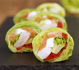 - キャベツ2枚を広げ、2の具材、サーモンを中心よりやや下にのせて、左右を内側に折り、手前から巻く。お好みの大きさに切っていただく。