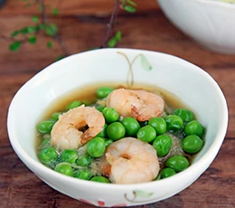 - 鍋にグリンピース、生姜、Aを加えて2分煮たら、海老を加える。