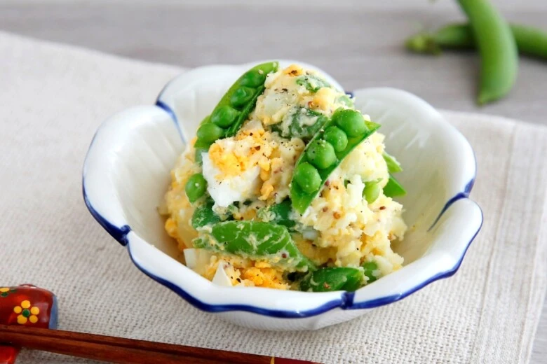 スナップえんどうは筋を取り除き、熱湯で1分茹で、冷水にさらす。じゃがいもは皮をむき、適当な大きさに切り、塩を加えて茹でる。