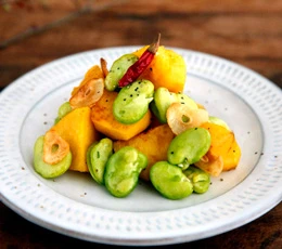 - じゃがいもの中心まで火が通ったらソラマメを加えて炒め、塩、黒胡椒で味を調える