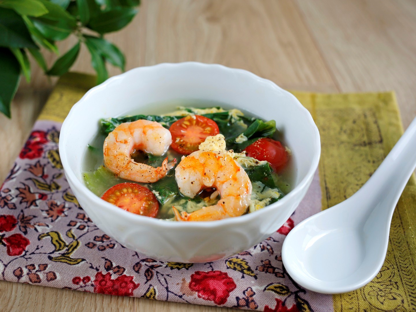 - 鍋にごま油(分量外)を熱し、ツルムラサキの茎をさっと炒め、海老、鶏ガラスープの素、水を加え中火で3分煮込み、塩・胡椒で味を調える。