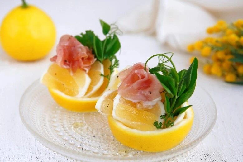 - 器(又は柑橘カップを使用)に①、生ハム、ベビーリーフを盛り付け、②をかけていただく。