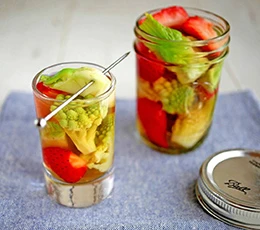 - 博多蕾菜、ロマネスコ、いちごは食べやすい大きさに切る。ロマネスコは熱湯で1分茹でる。
