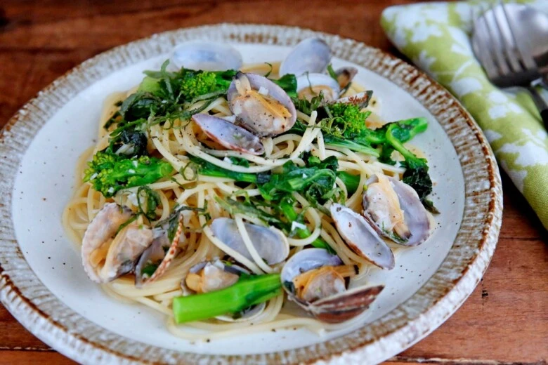 - フライパンに白ワインとあさりを加え、殻が開くまで蒸し、一度取り出す。オリーブオイルとにんにくを熱し、香りが出てきたら菜の花を炒める。