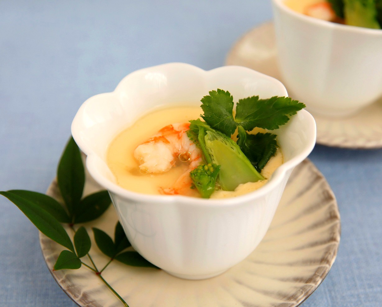 - 耐熱容器に等分にした鶏ささみ、筍、海老、蕾菜の順に入れ、①の卵液を流し入れる。アルミホイルで蓋をし、2つ作る。